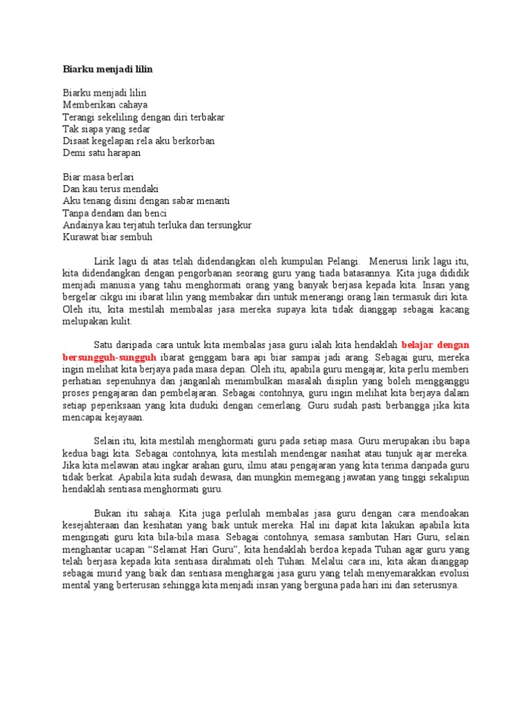 Lagu Guru Umpama Lilin 2011 10 July 3 June 4 May 3 Followers Terima kasih kerana mengunjungi dan memberi sokongan kepada penulisan saya. Guru umpama lilin yang membakar diri demi menerangi orang lain.